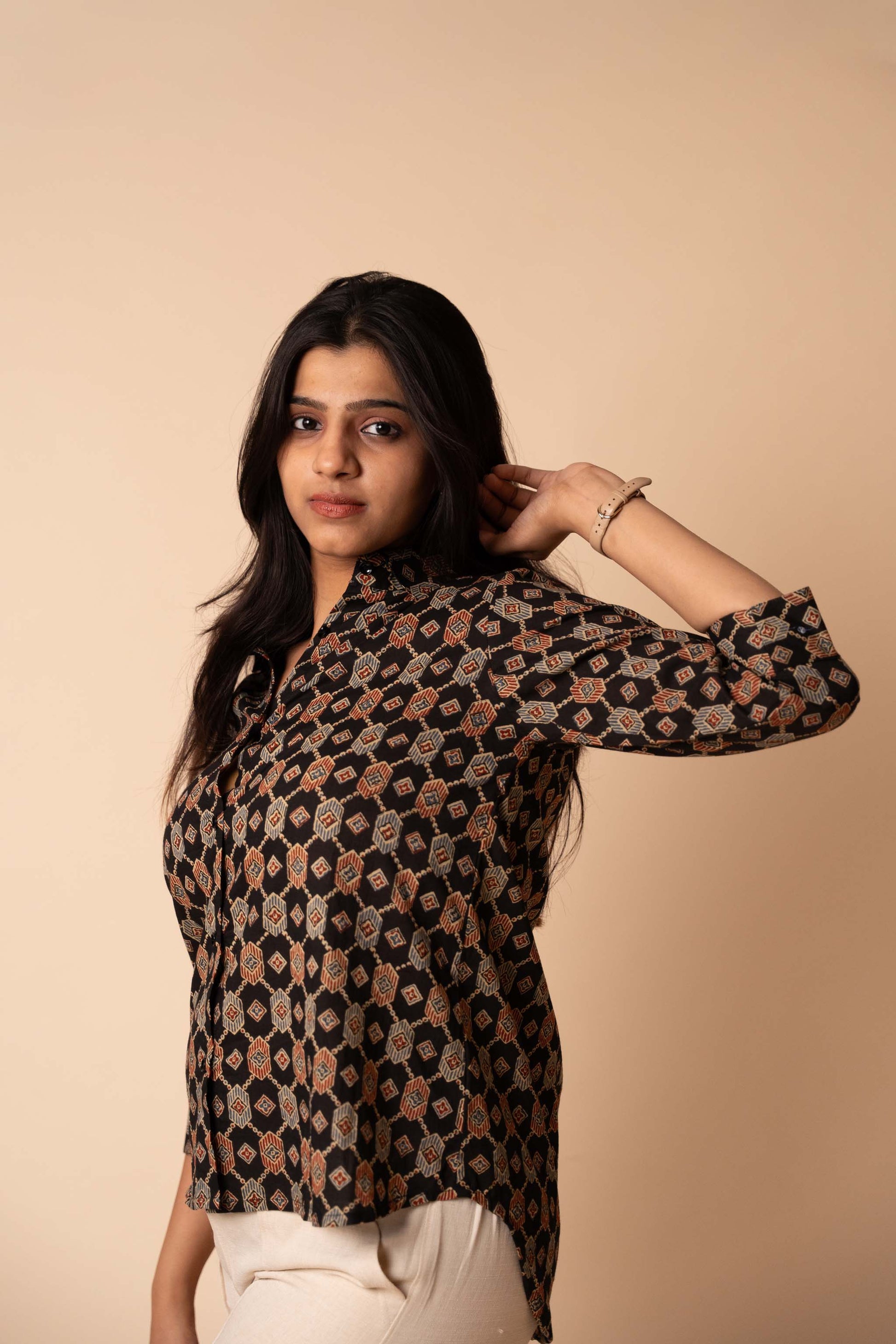 Crafted from cotton, this black ajrakh printed shirt offers a comfortable regular fit ideal for both casual and formal settings. Featuring 3/4 sleeves with and a classic shirt collar, it combines traditional style with modern comfort. Comes with High Low pattern makes it a versatile addition to your wardrobe.