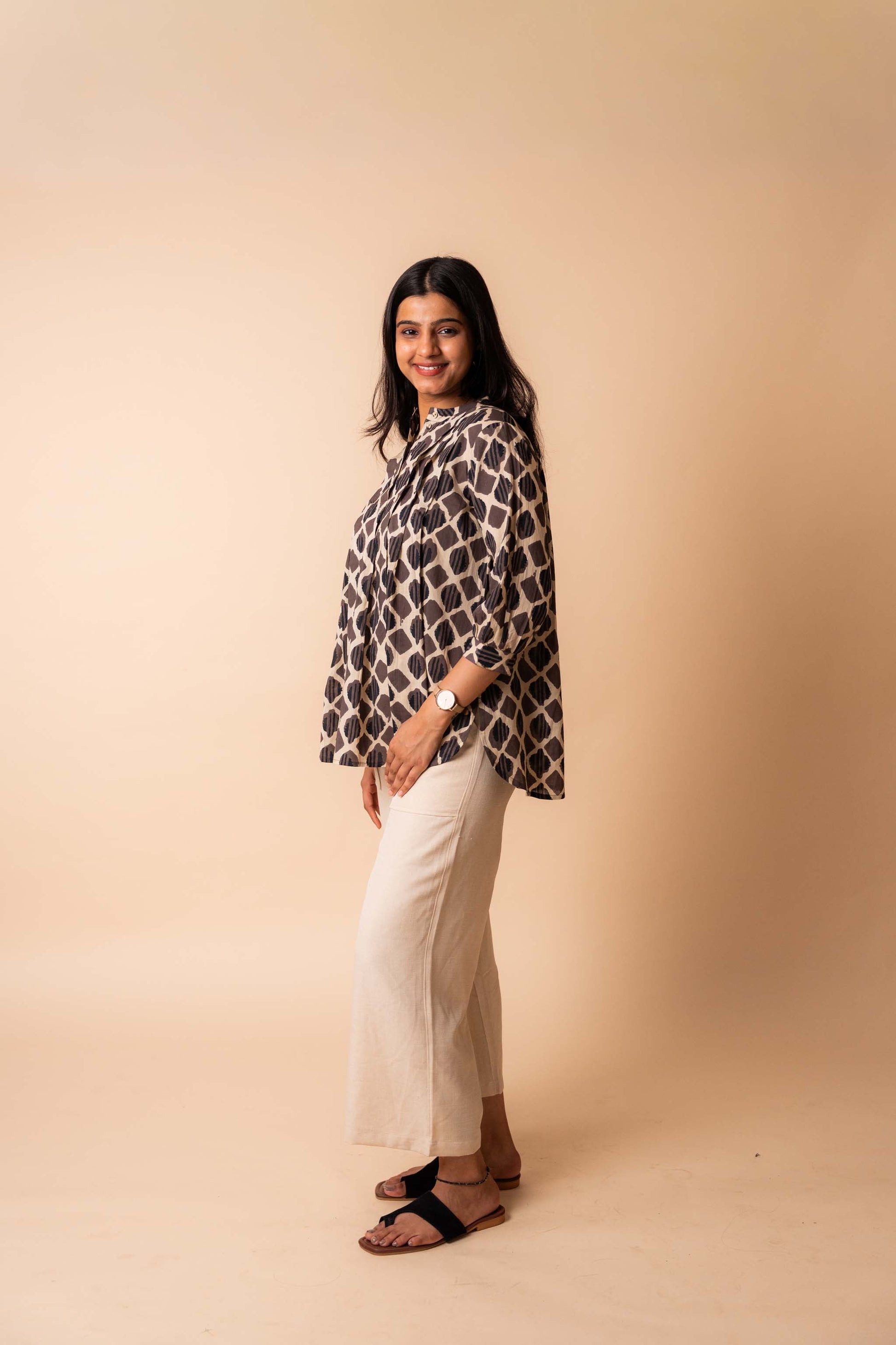 Brown cotton top with a relaxed fit, 3/4 sleeves, and a mandarin collar. Features pleats on both sides, a back yoke, and a stylish C-cut hem perfect for casual or ethnic wear