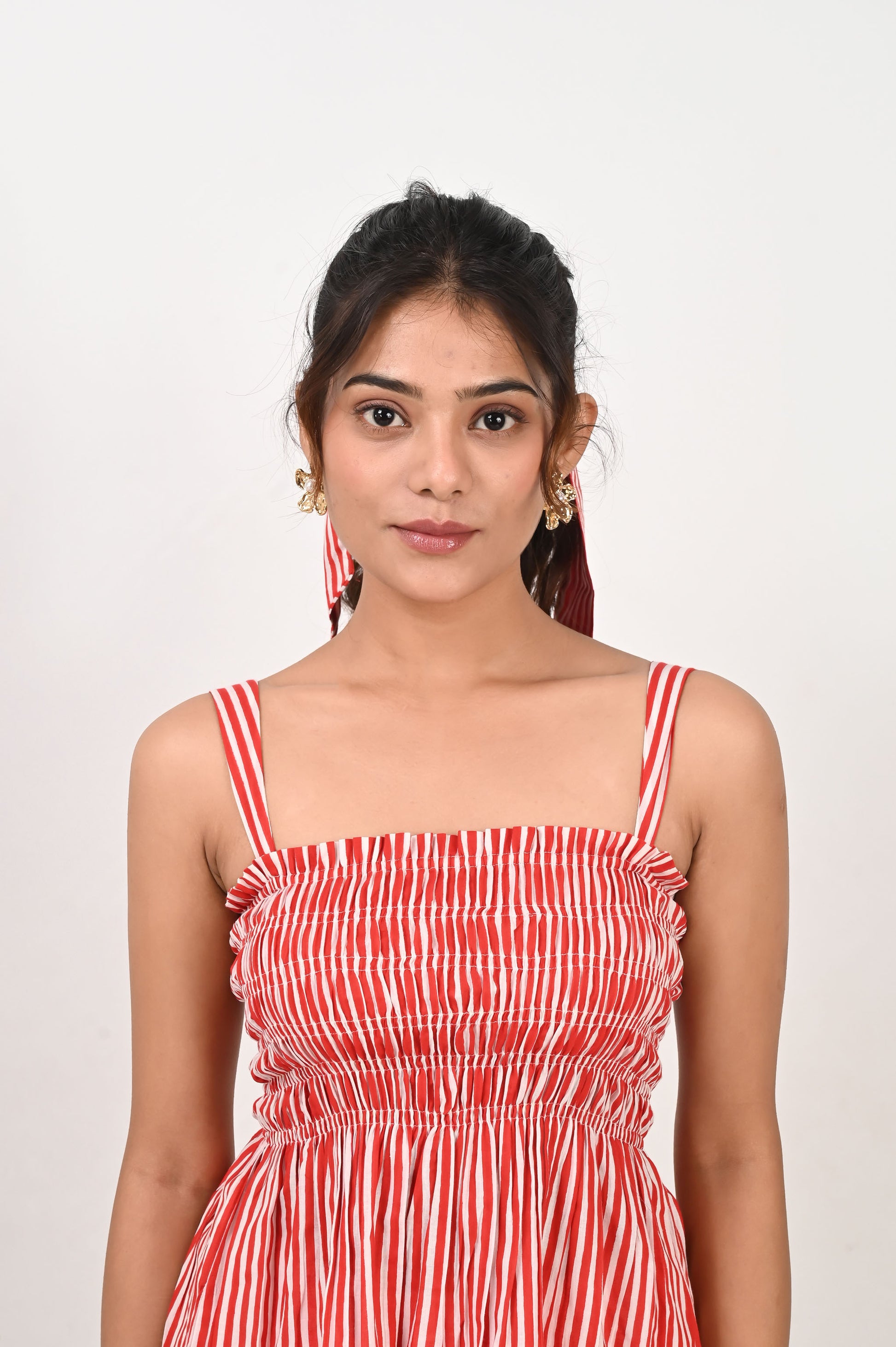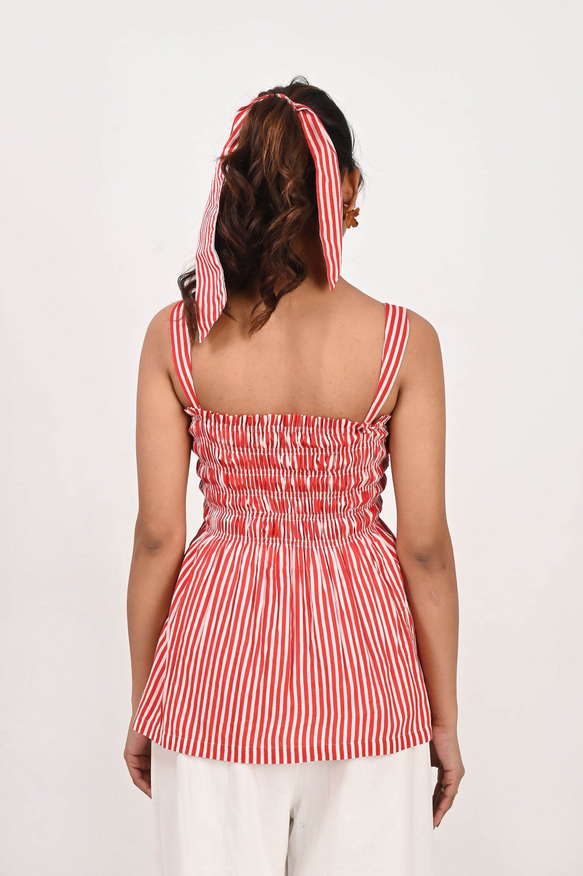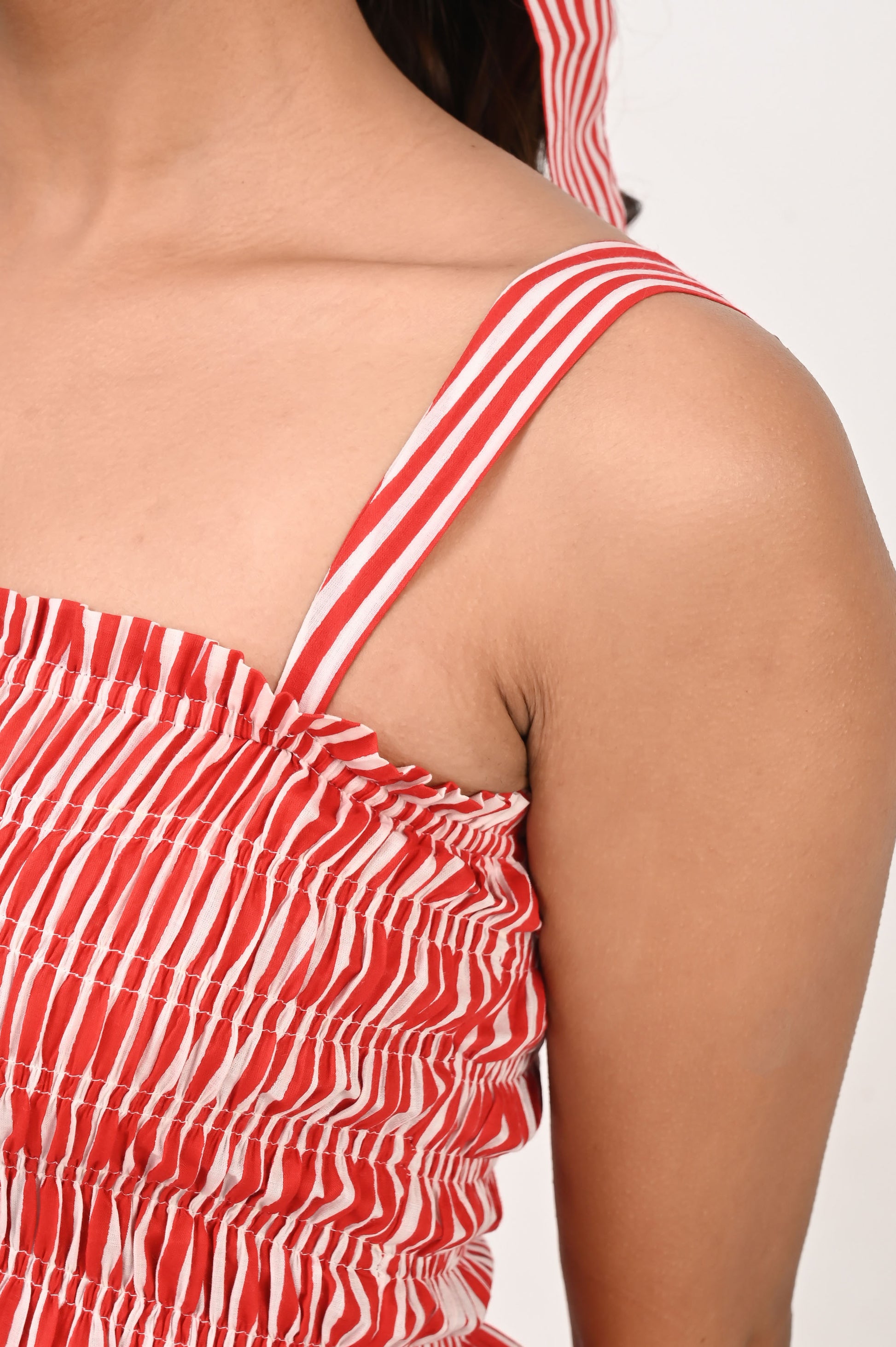 Red- white striped top with shoulder straps in 100% cotton. Smocked bodice featuring a straight, frill- trimmed neckline.