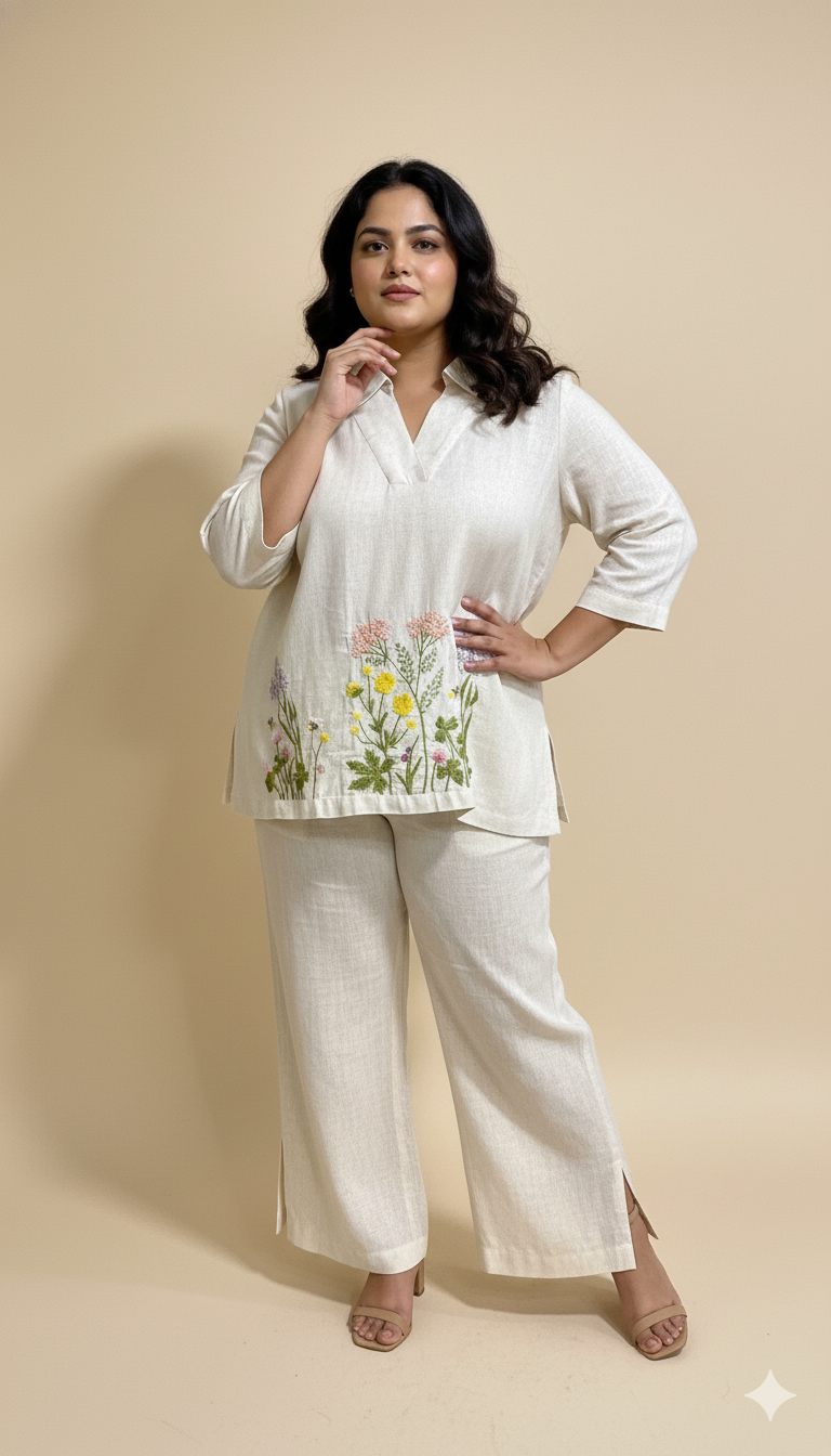 Flex Cotton top in Ecru with V-neck shirt collar, 3/4 sleeves, and thread embroidery. Works for casual and formal wear. Features a side slit for comfort. Machine wash, dry in shade, iron on low inside-out.