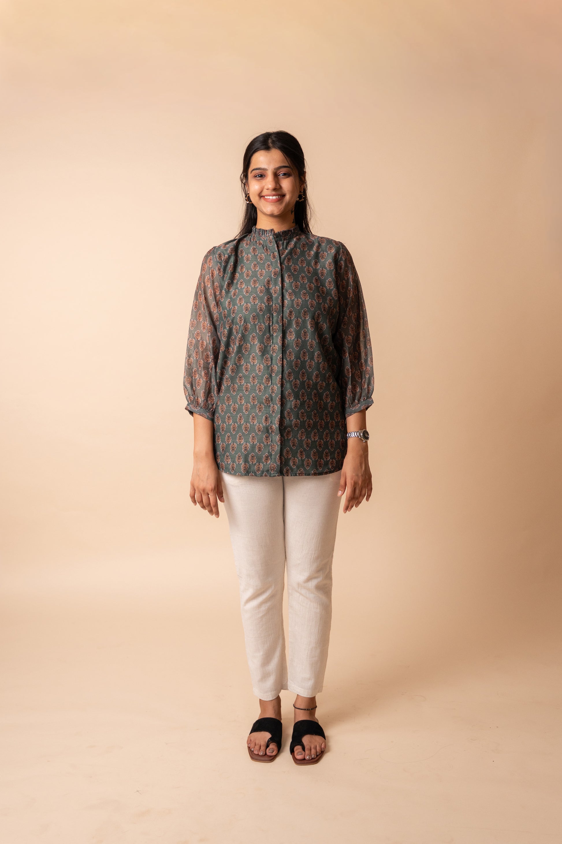 - Additional details: Printed, Inner lining, Side slit, Ruffles on Collar